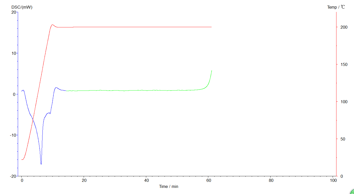 点击图谱使其变成绿色,即选定图谱,点击任务栏中【分析】—【氧化诱导期】—出现左右两根黑线,拖动左侧分析线在变化前端,右侧分析线在变化后端,选取好后,点击【应用】,【确定】,再点击该曲线,使其变成玫红色,分析完毕。分析好的图谱如下图