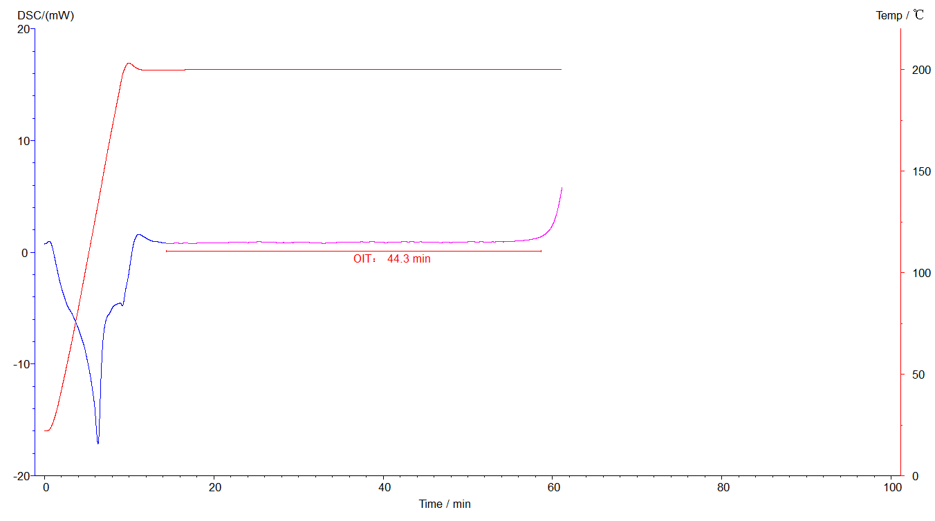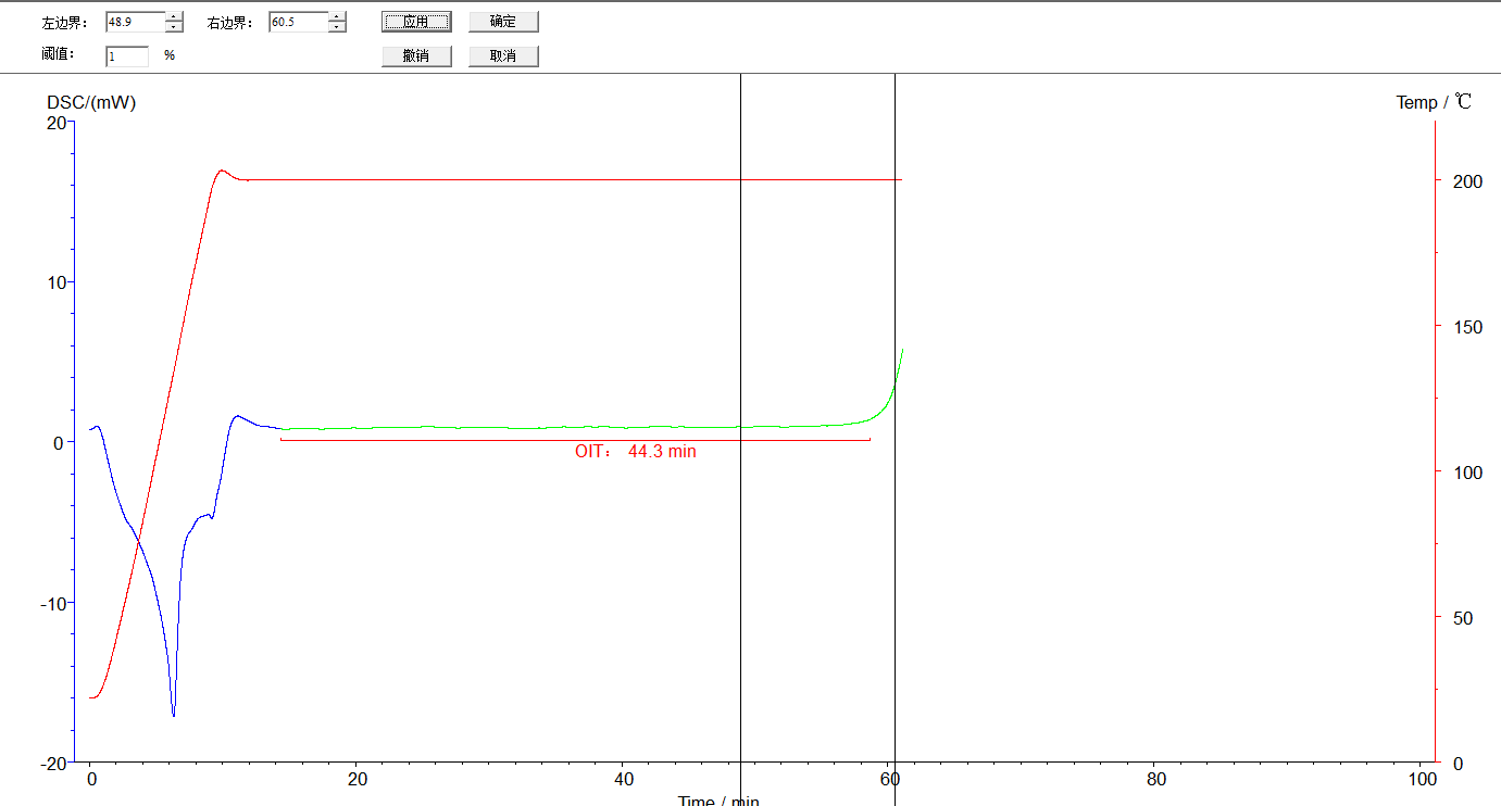 点击图谱使其变成绿色,即选定图谱,点击任务栏中【分析】—【氧化诱导期】—出现左右两根黑线,拖动左侧分析线在变化前端,右侧分析线在变化后端,选取好后,点击【应用】,【确定】,再点击该曲线,使其变成玫红色,分析完毕。分析好的图谱如下图