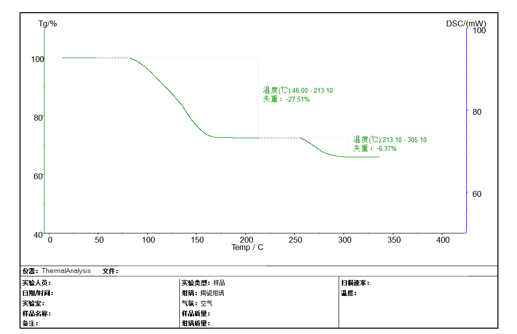 实验原理是将试样与参比物放入坩埚后,按设定的速率升温,样品在加热过程中,会有挥发、分解等变化,变化过程中会伴随着重量的变化。软件记录着重量与时间/温度的关系。